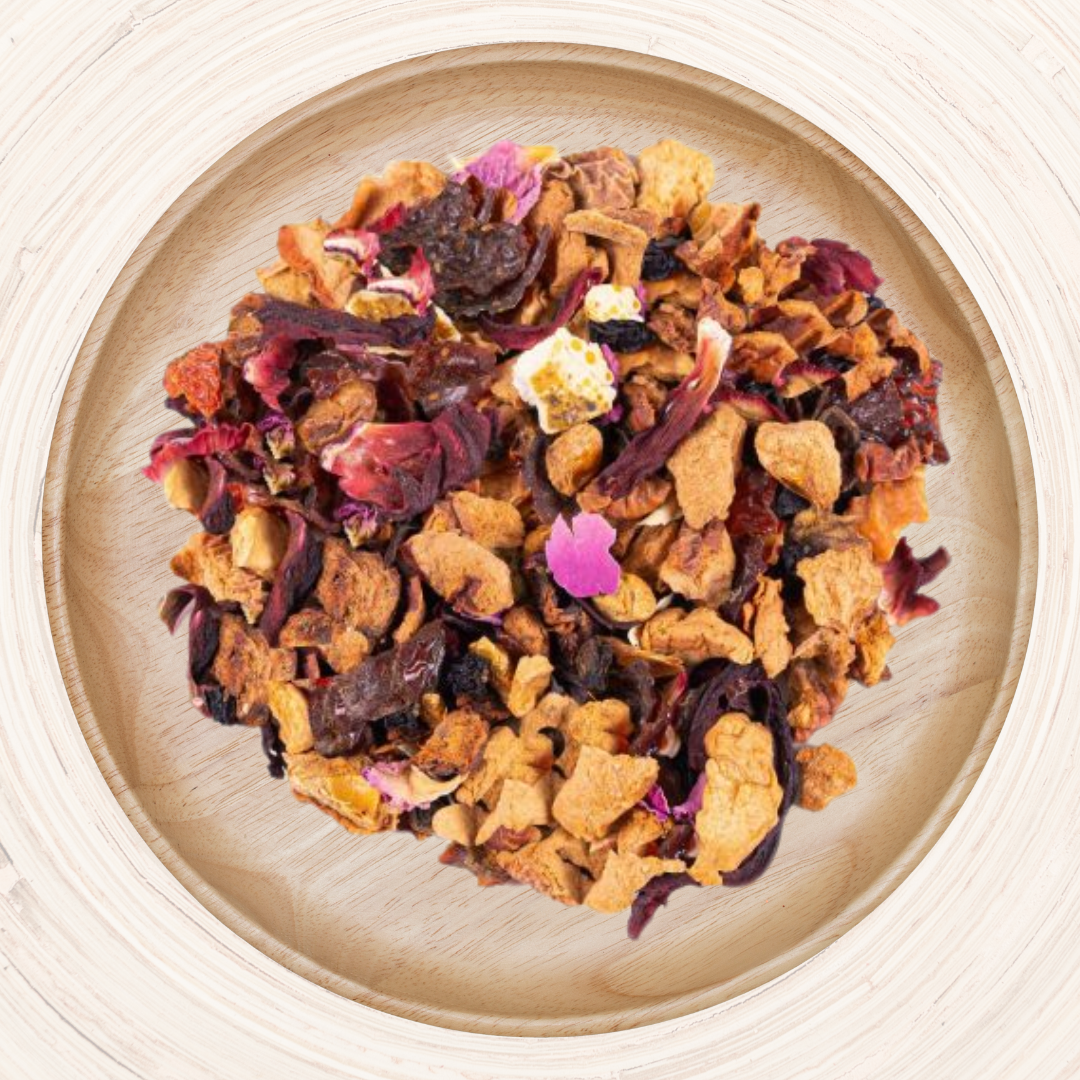 Ingrédients: pomme, cynorrhodon, hibiscus, baie de sureau, écorces d’orange, pétales de rose, arôme naturel